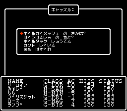 | ブリスケット | 「ロードに向いてる職場ってぇと、戦士の技術を学べる場所か、 あるいは僧侶呪文が活かせる場所っすね…………どこでやしょう?」 |